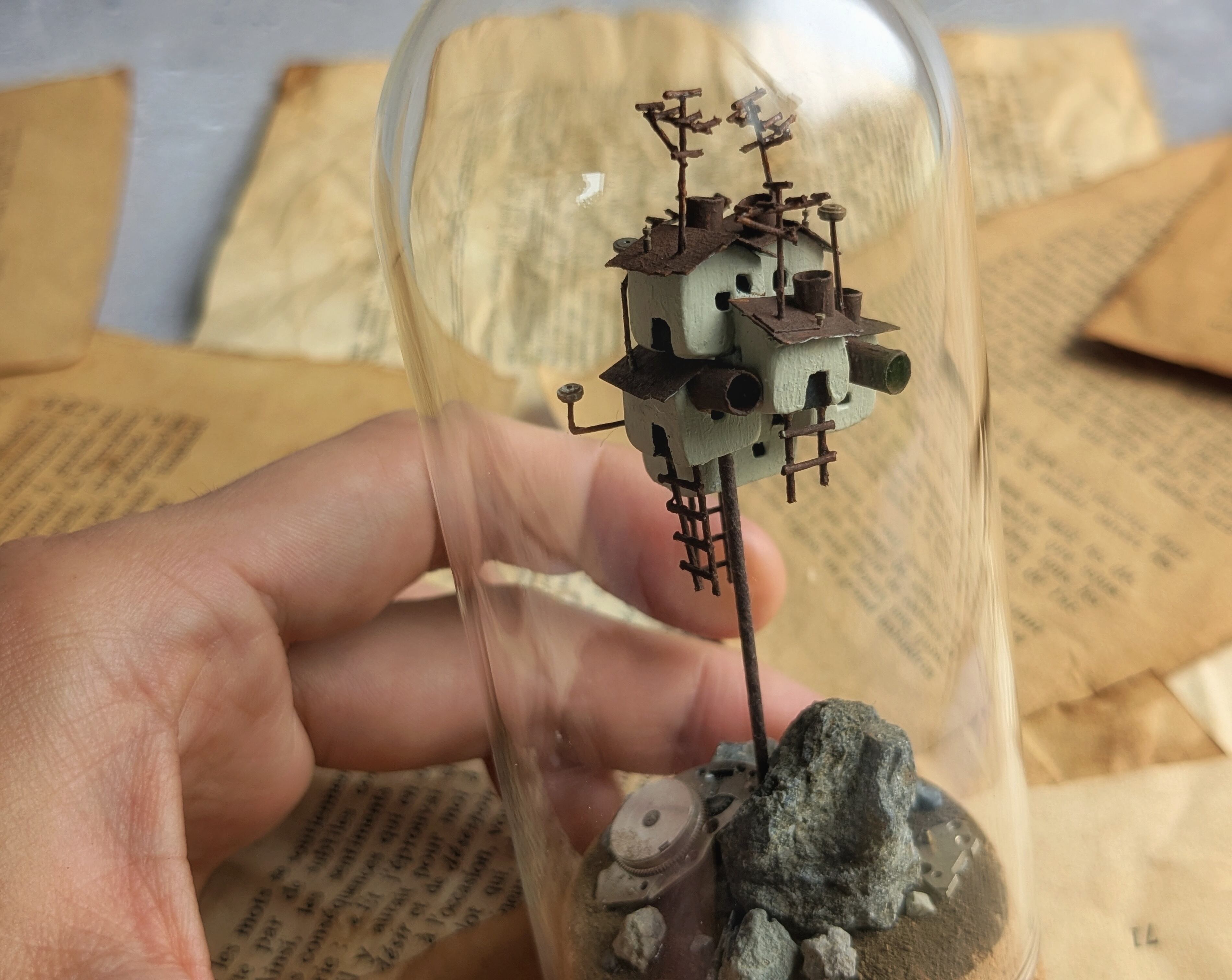 ガラスドームに入った空中都市。錆びれた小さな家がいくつか組み合わさってできています。 サイズ:直径5cm×高さ10.5cm