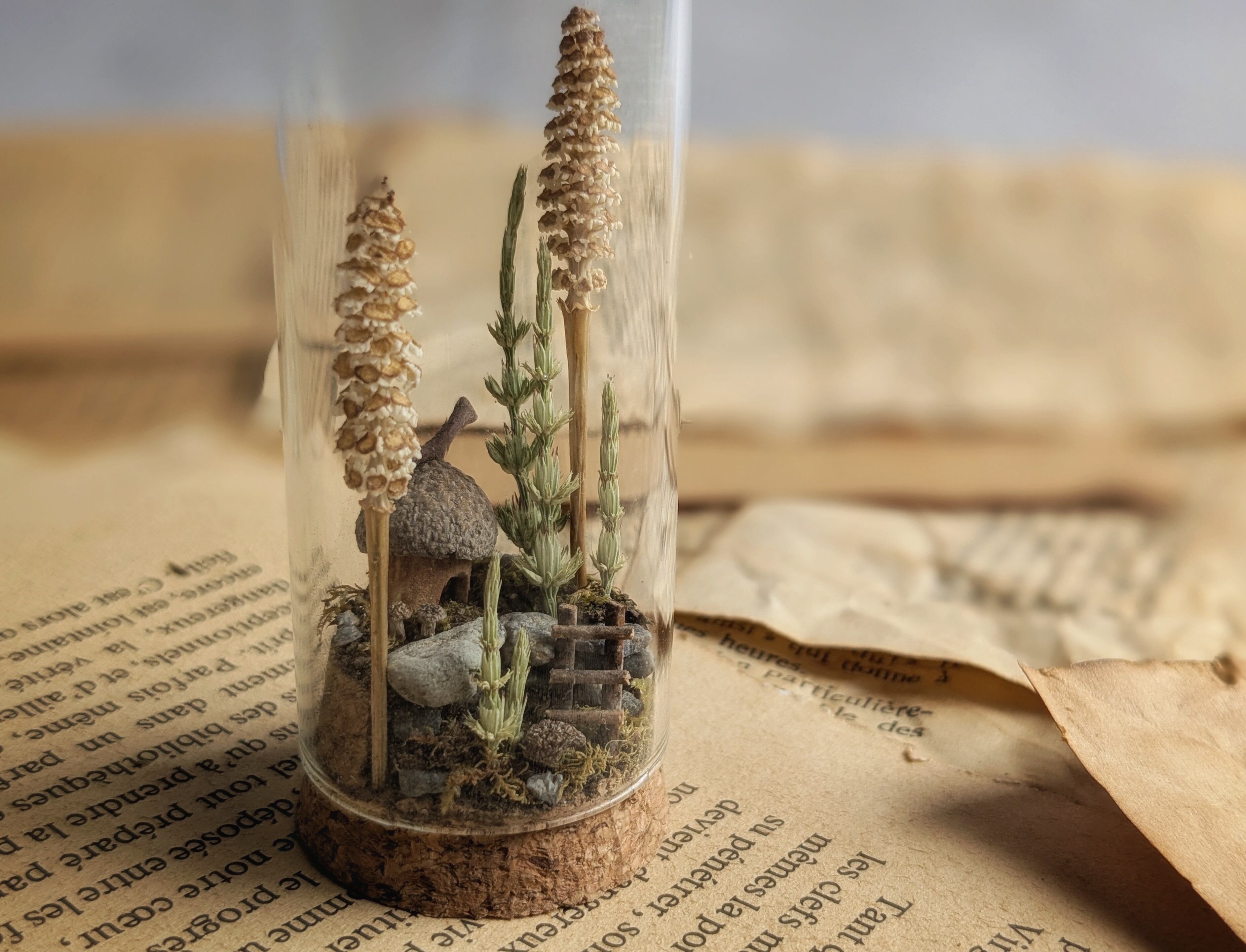 どんぐり帽子の小さな家と、ドライフラワーにしたつくしのオブジェ。