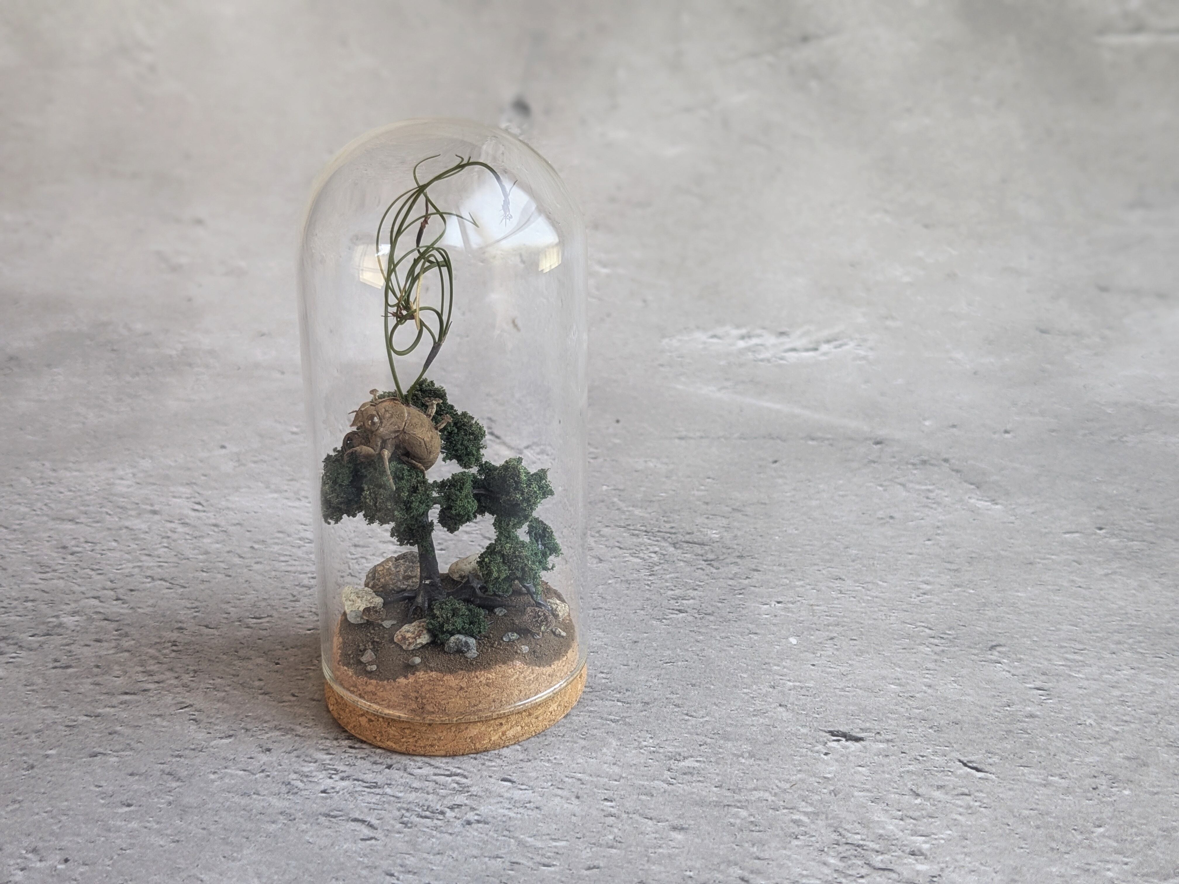 ガラスドームに入った、セミの抜け殻と木のオブジェ。