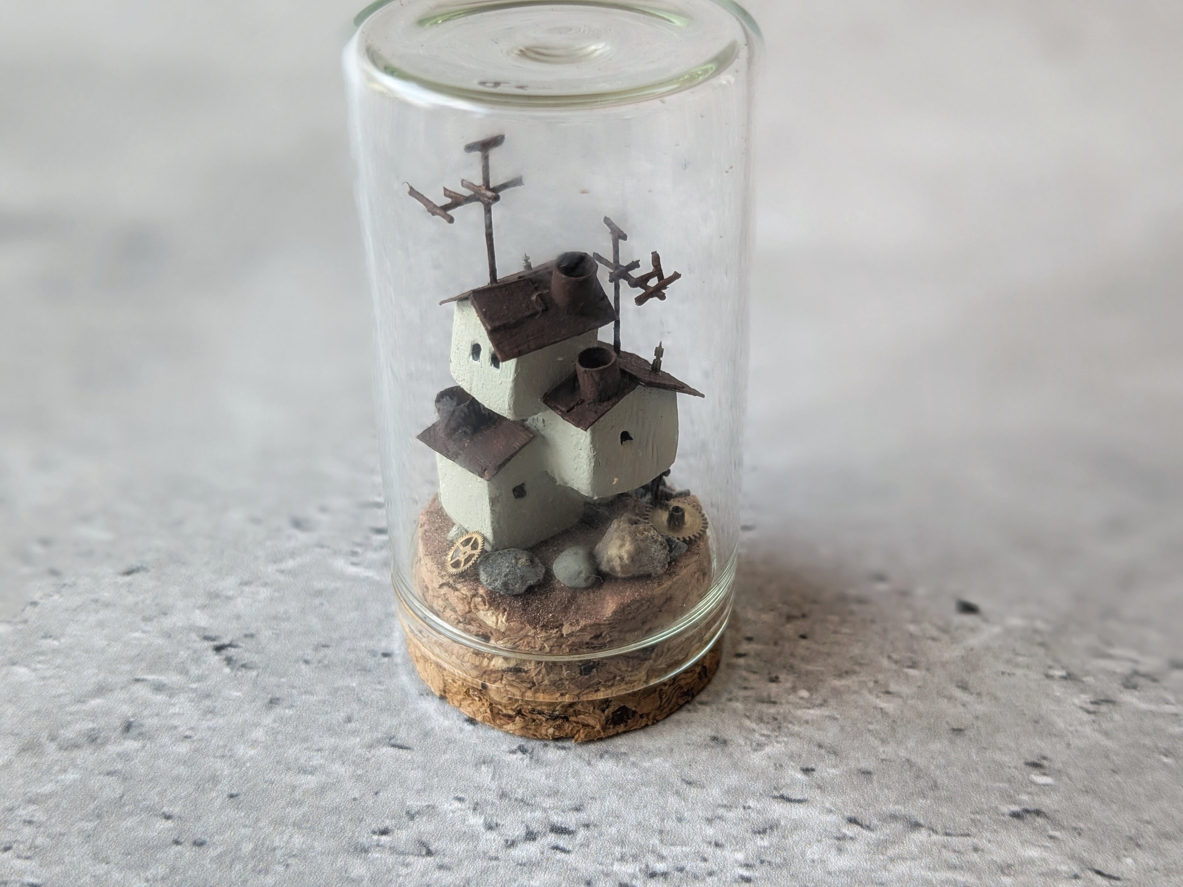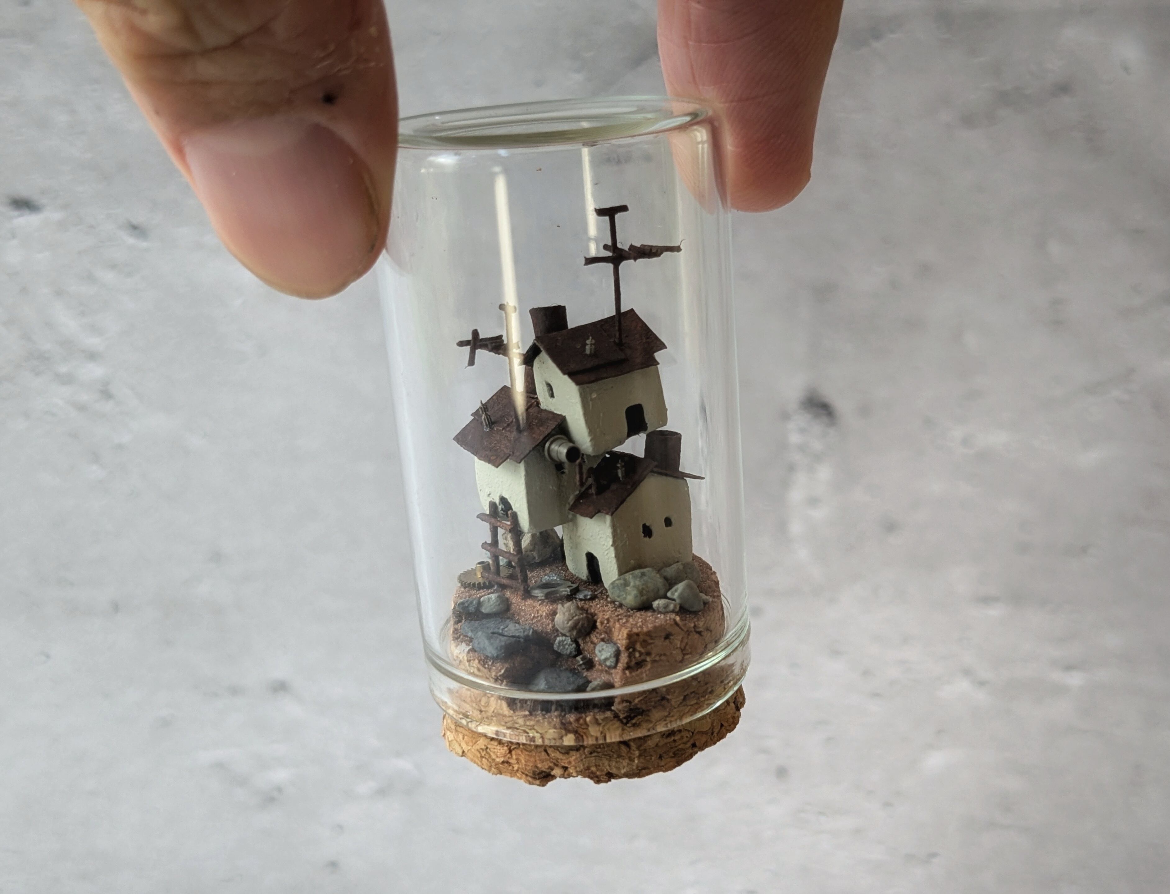 かつて旅人が積み上げた三つの家。誰も住まなくなった今も、石ころの丘の上で、時を重ねるように静かな物語を刻んでいる。