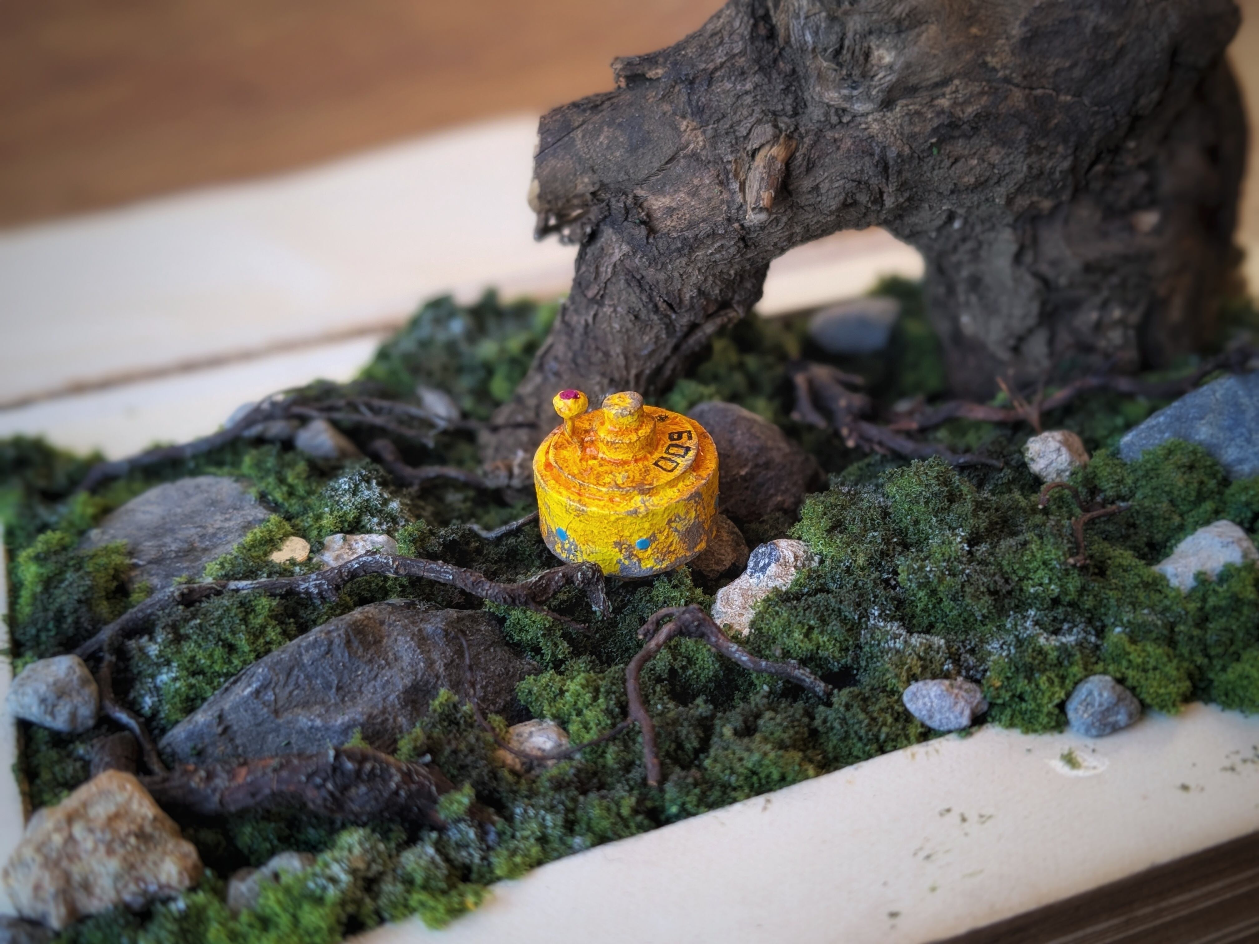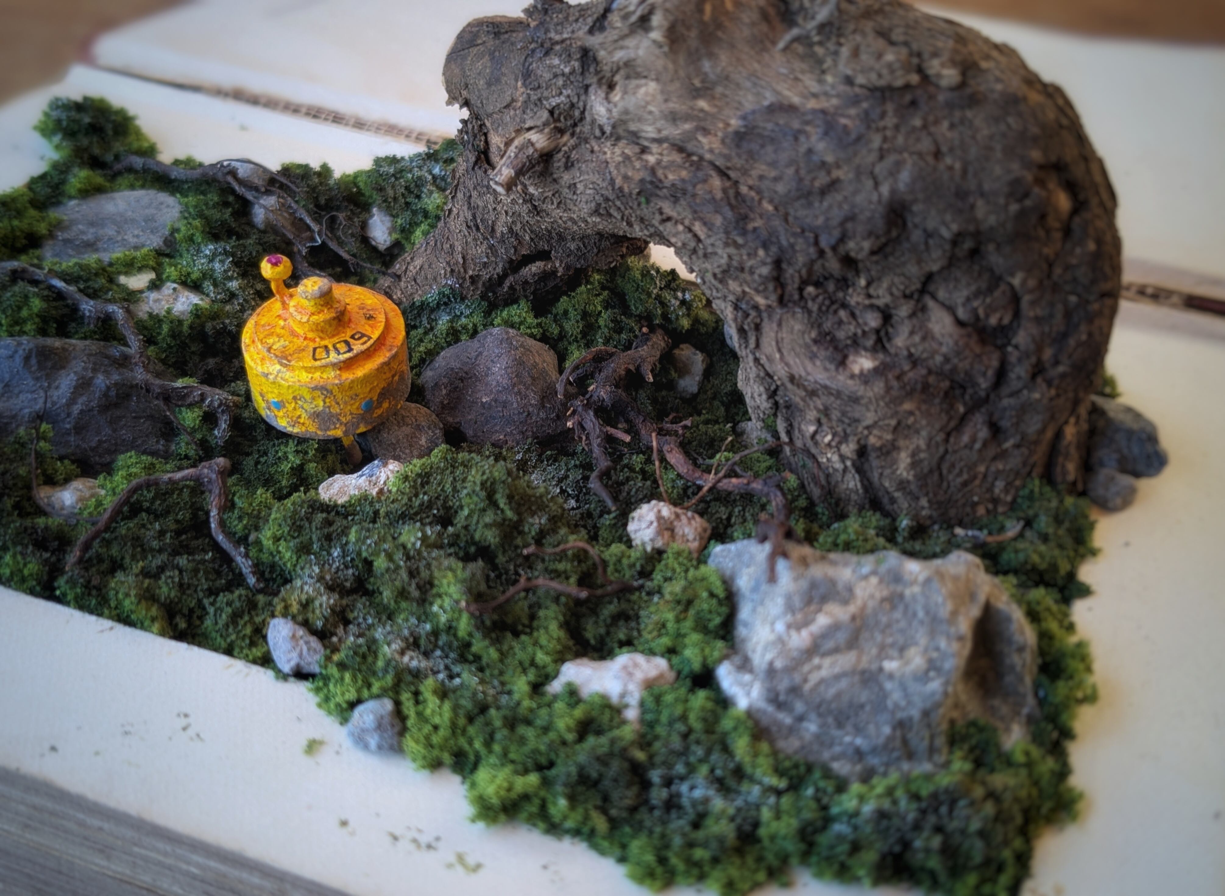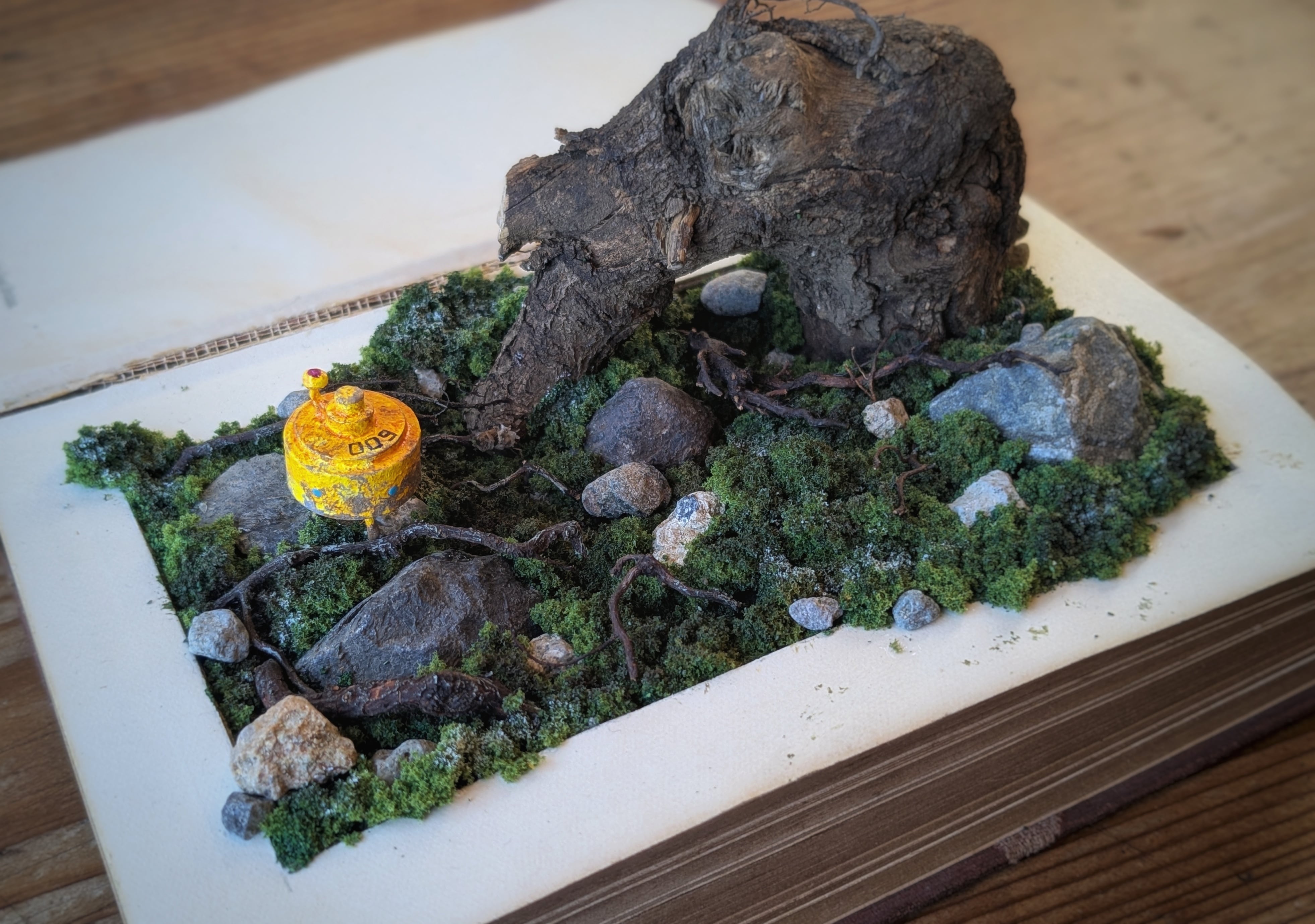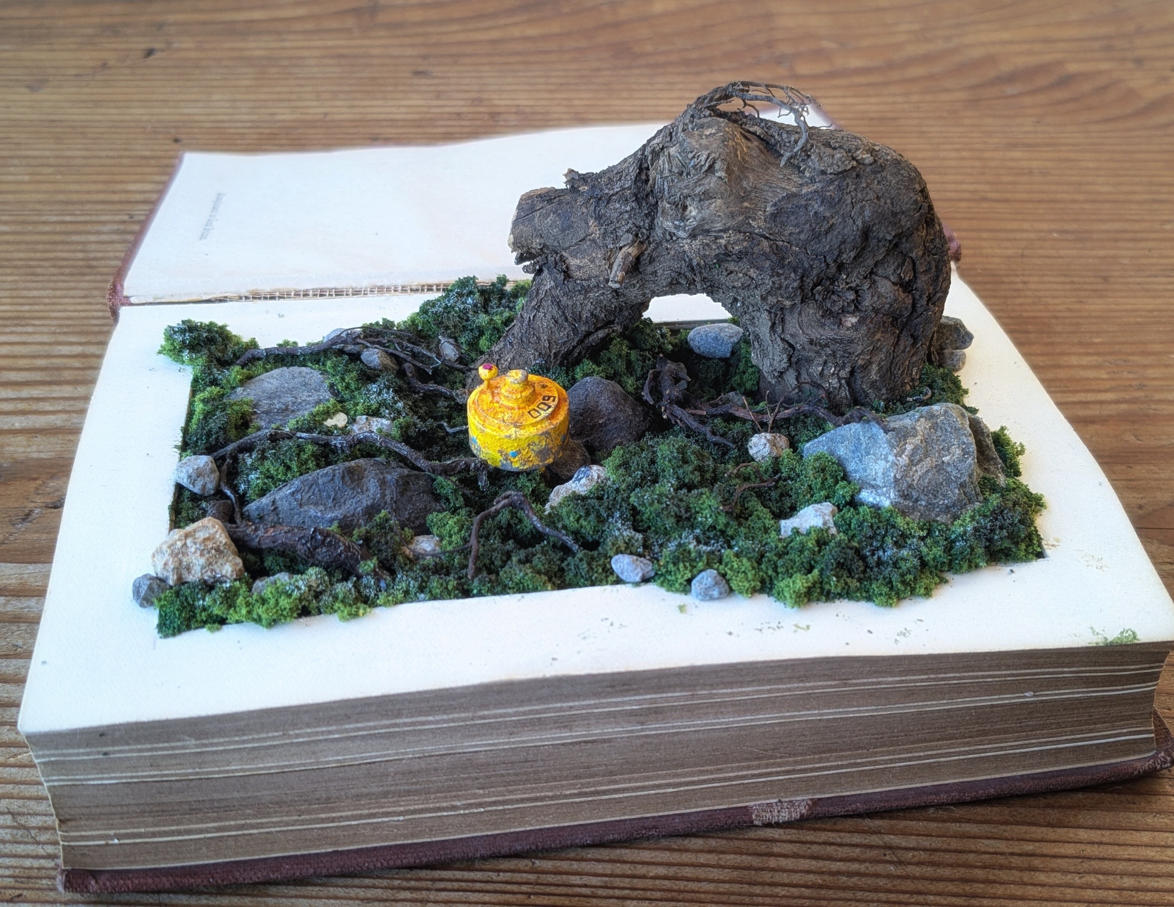 黄色い機体のミニフィラエ。古本をくりぬいた樹のかけらの世界に来てもらいました。固定していないので、自由に置いて飾れる仕様です。※小さな磁石が埋め込まれていて、くっつけることができます。