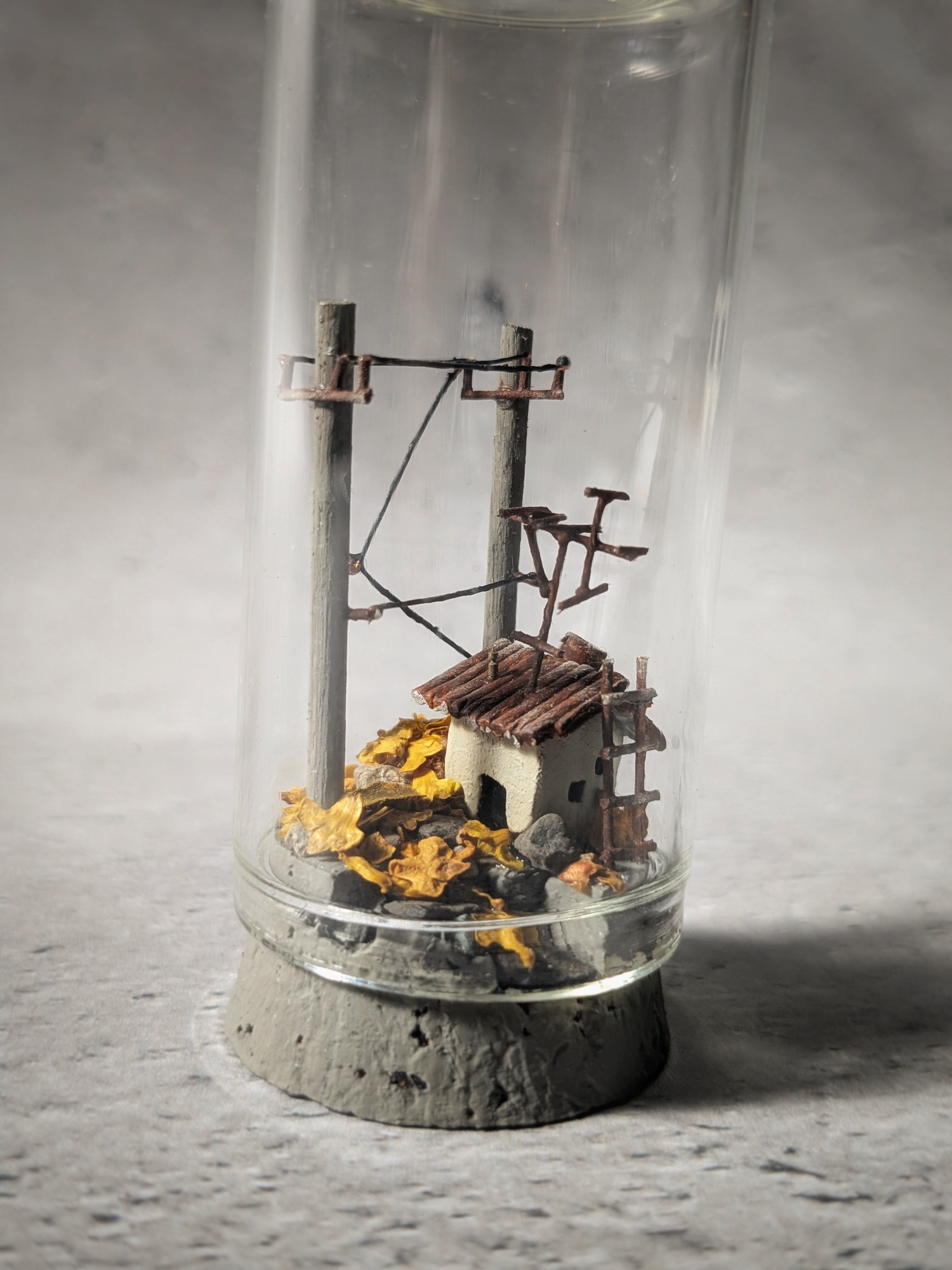 錆びれたトタン屋根の小さな家のオブジェ。黄色い落ち葉が降り積もっています。