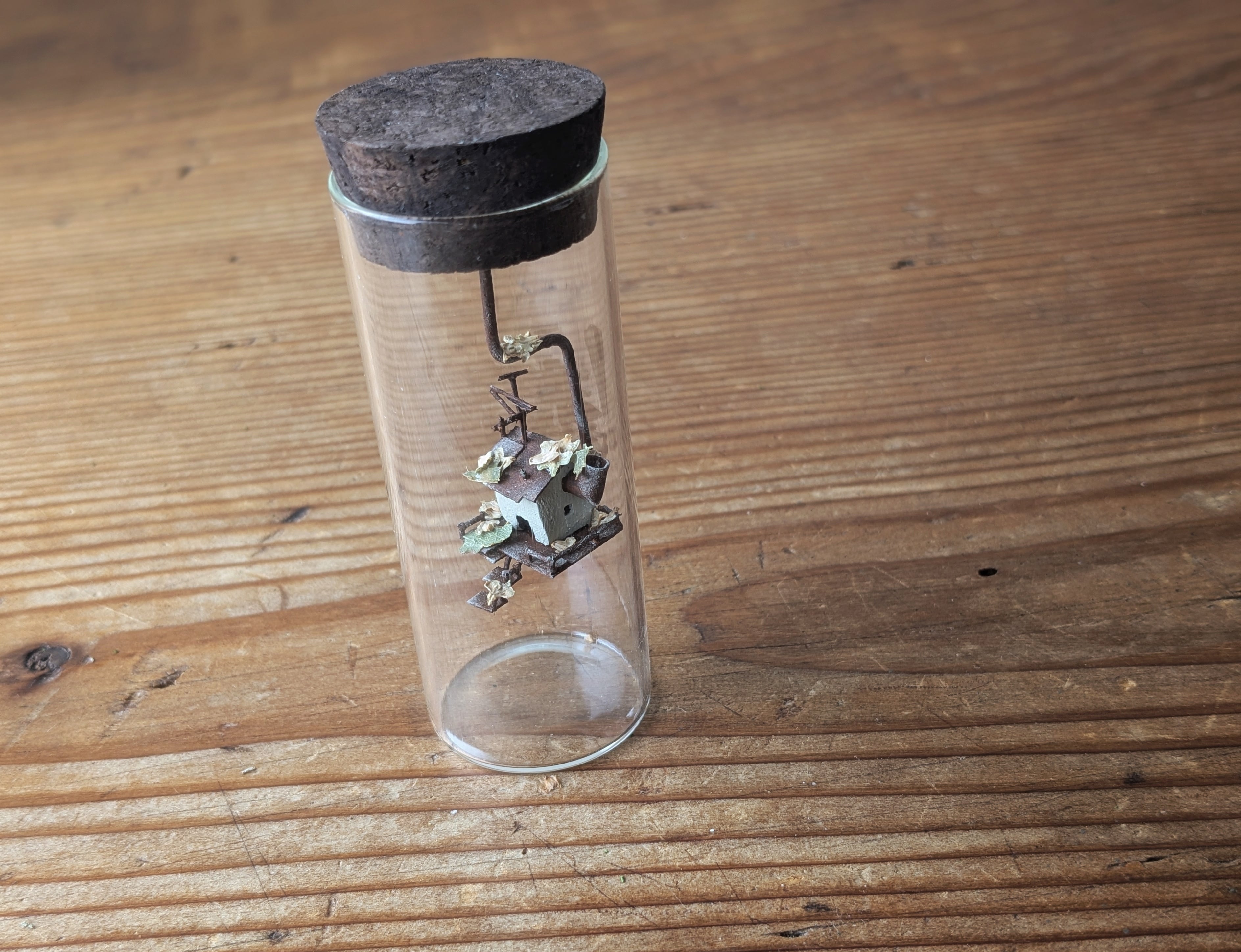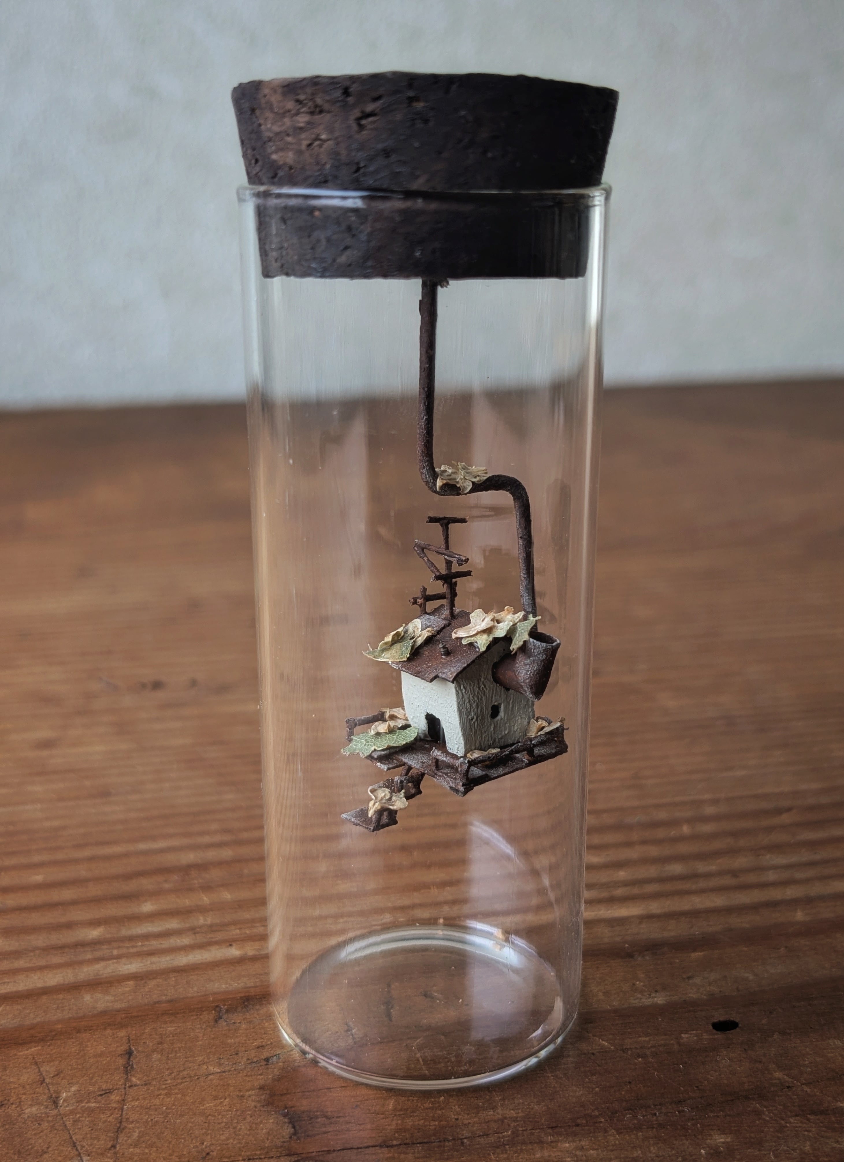 小瓶に入った空中都市、ぽつんと一軒家。落ち葉が降り積もってます。