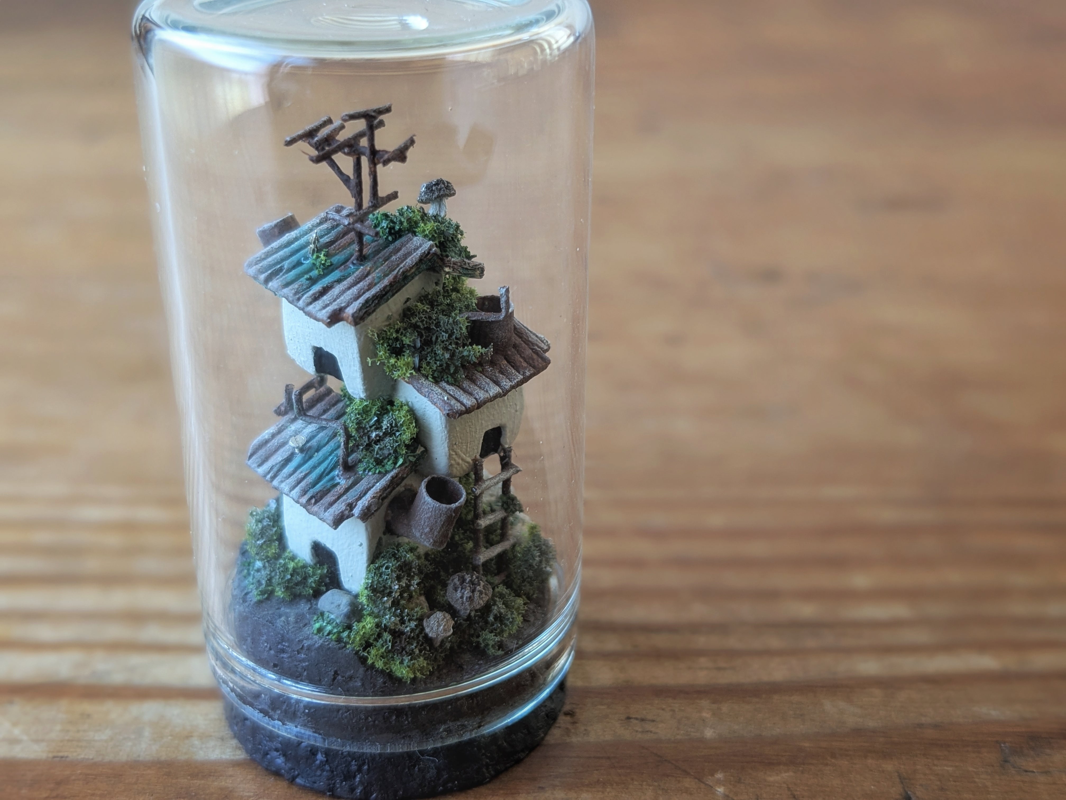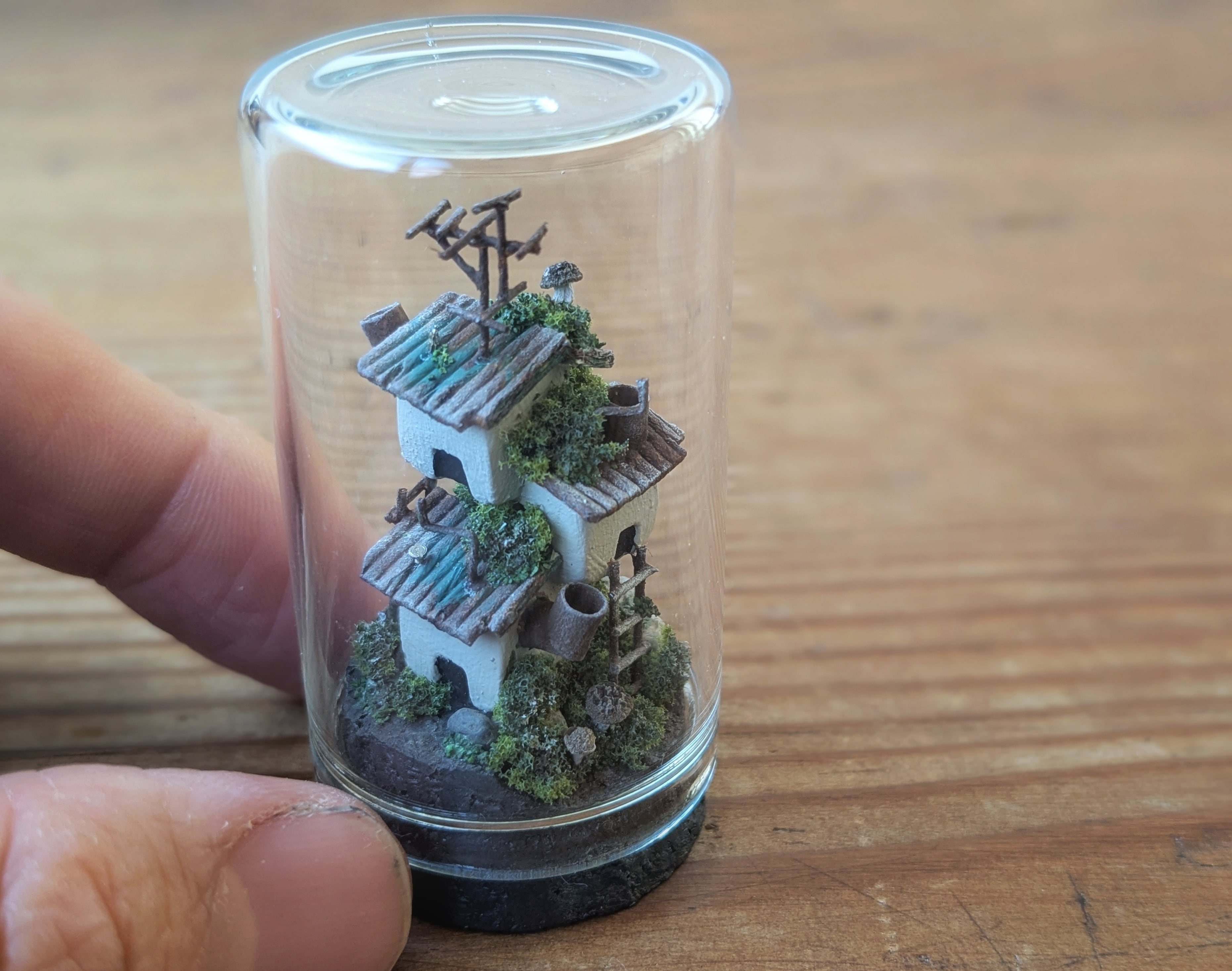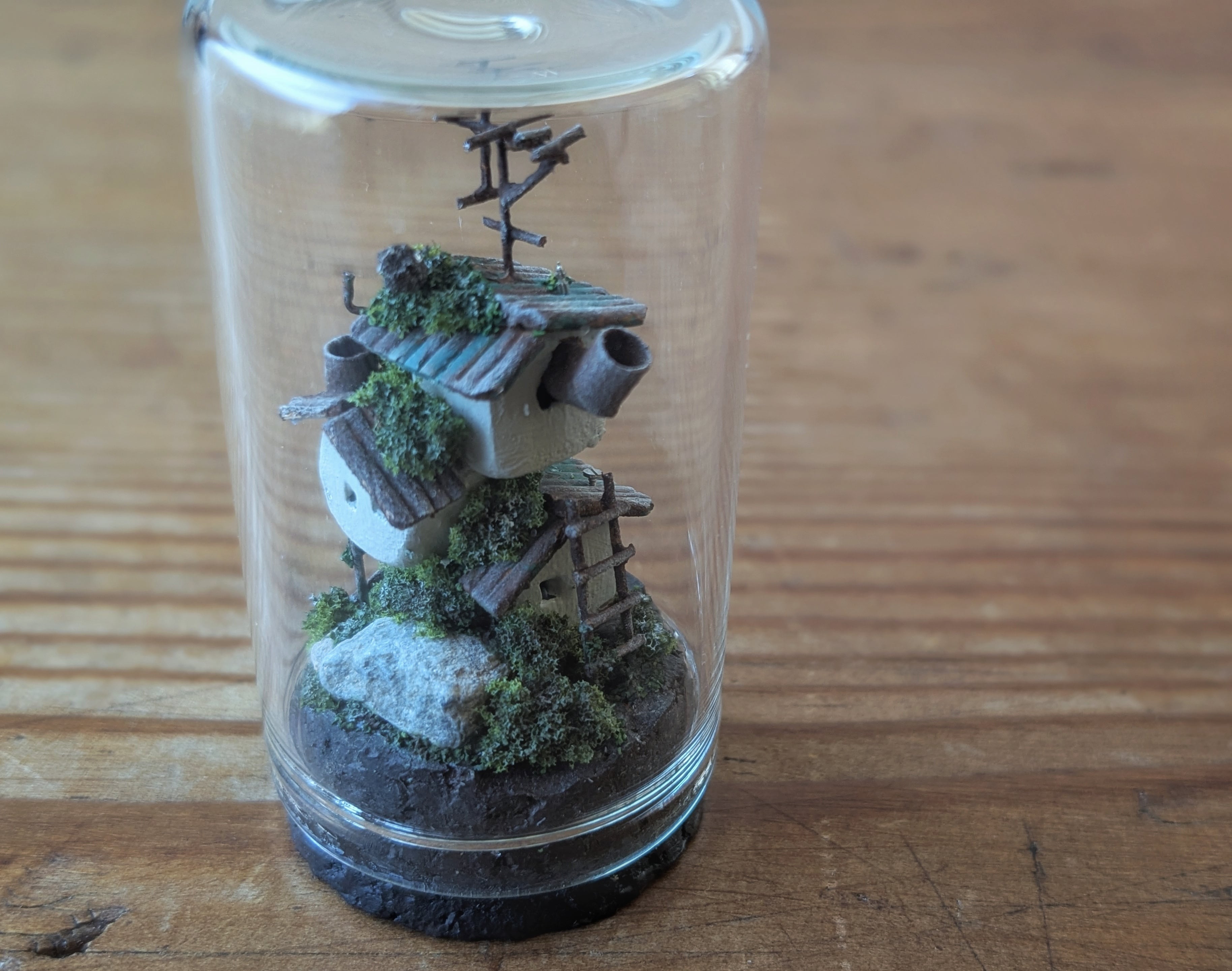 かつて旅人が積み上げた三つの家。誰も住まなくなった今も、苔生した丘の上で静かに時を重ねている。