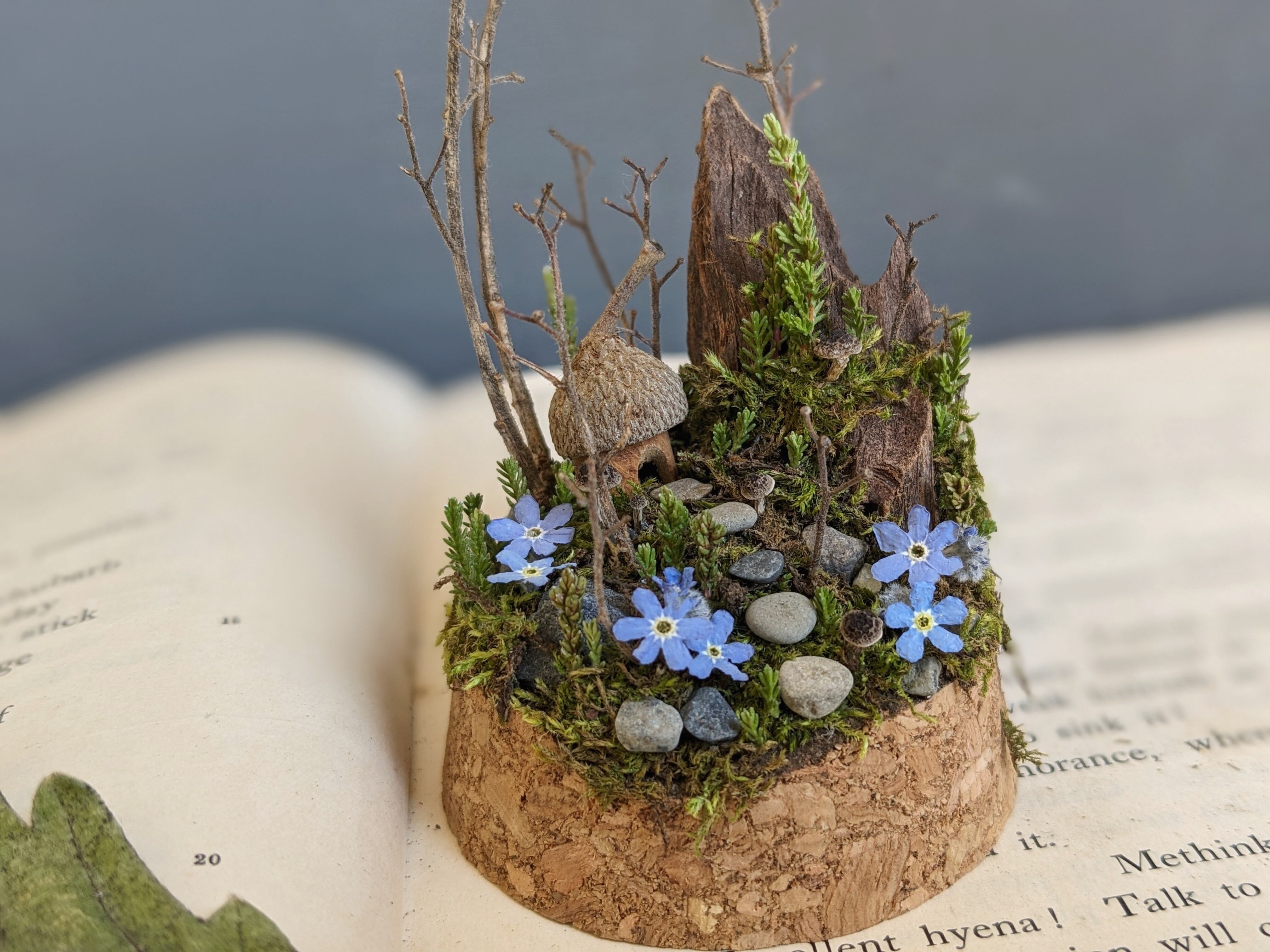 ぽつぽつと勿忘草が生える森の中。どんぐり帽子の小さな家がひっそりと佇む風景。そんな不思議な、小さな世界を机の上に置いてお楽しみください。