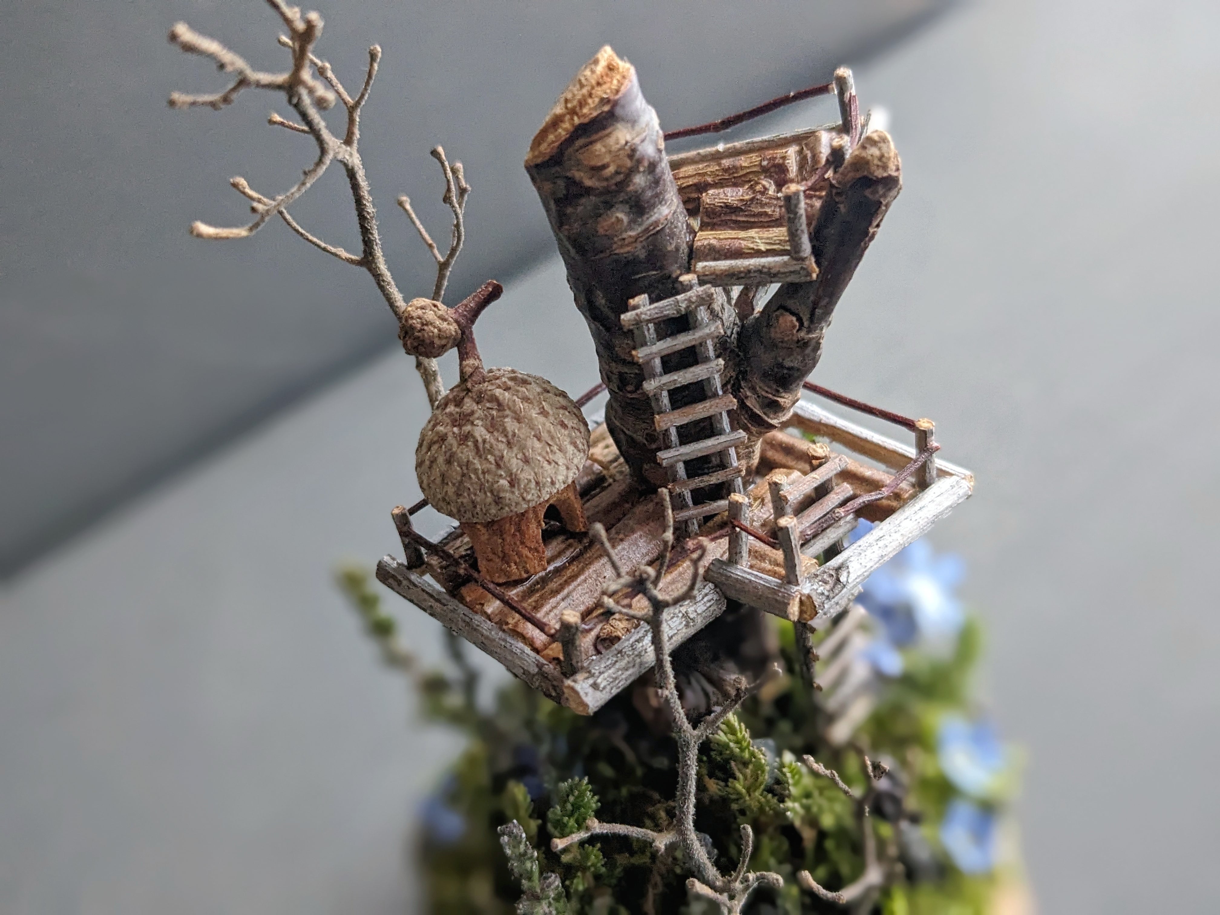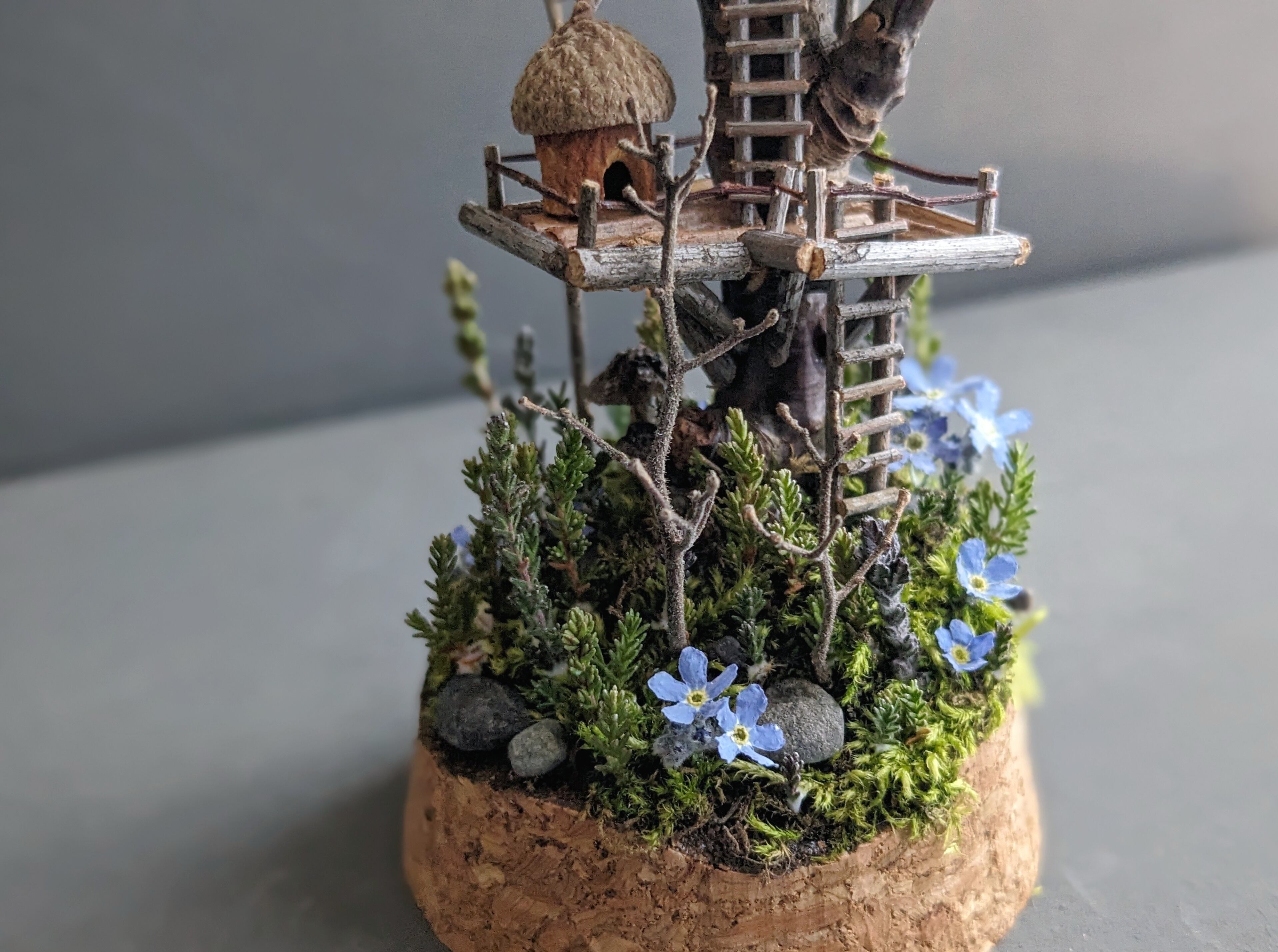 ガラスドームに入った小さなツリーハウスオブジェ。足元には勿忘草が咲いています。