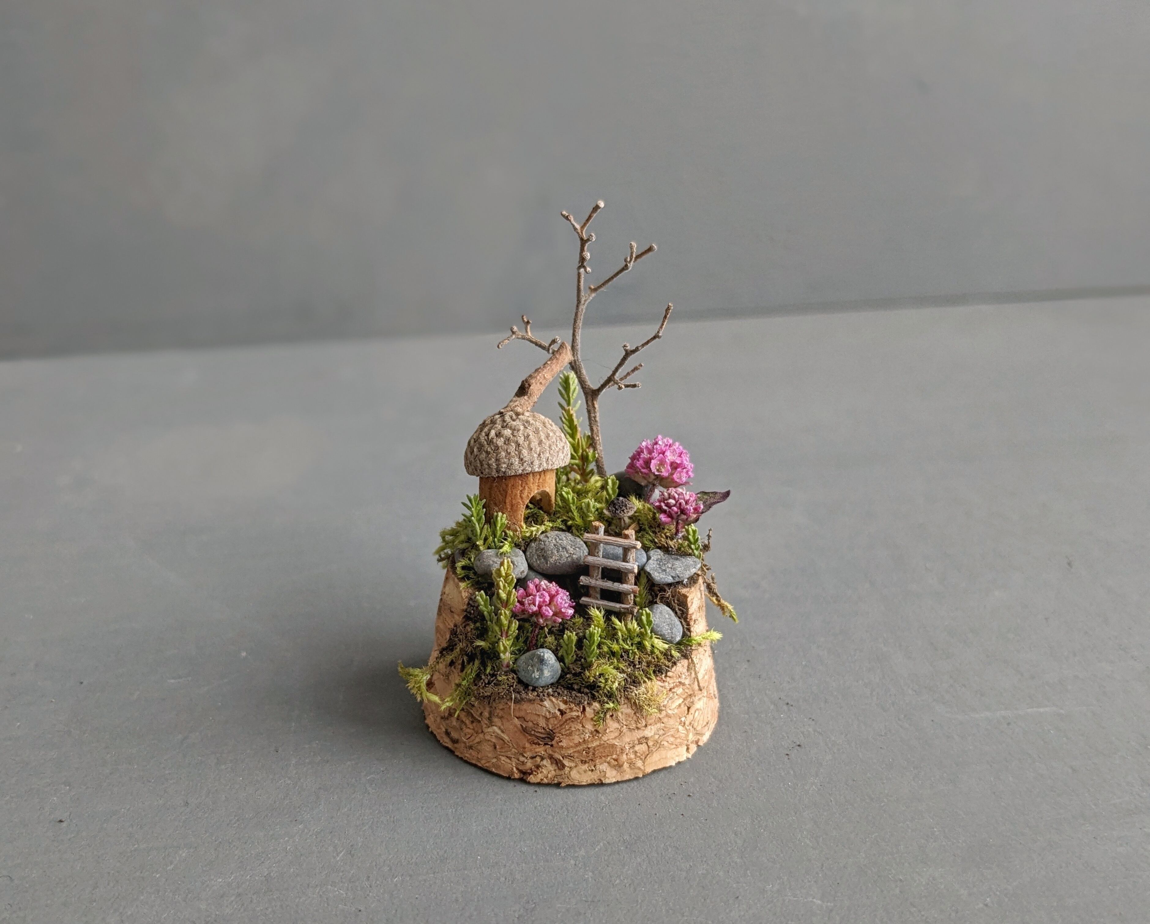 小瓶に入ったどんぐり帽子とシナモンの家。庭にヒメツルソバが咲いています。このサイズ感だと、なんだか小さな紫陽花のよう。