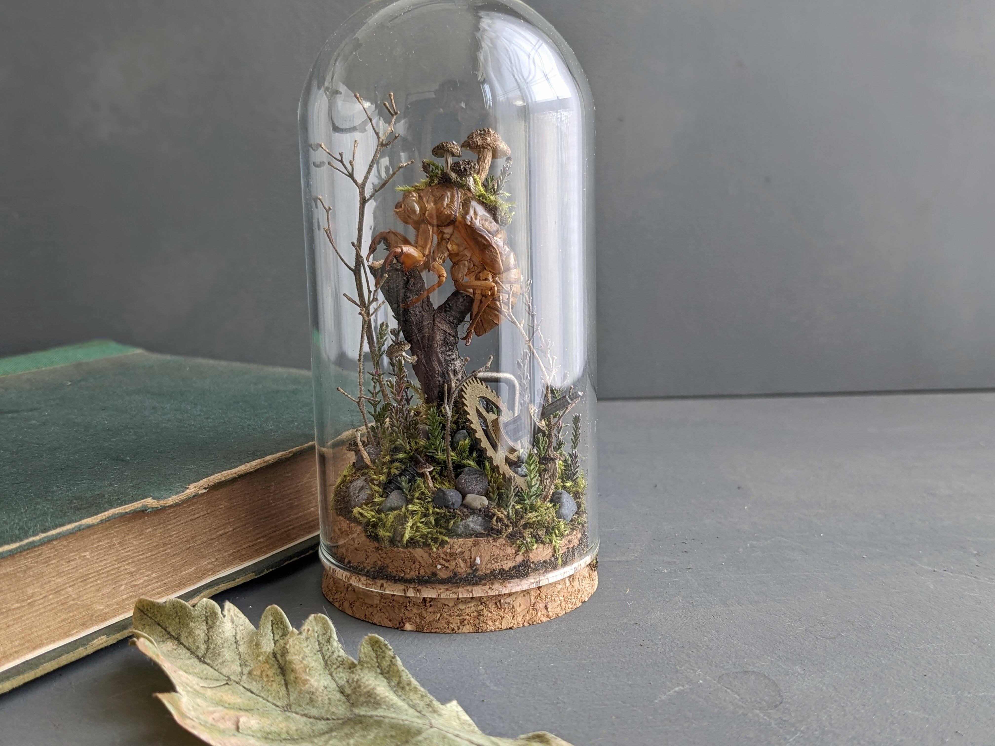 ガラスドームに入った蟬の抜け殻と歯車のオブジェ。苔や葉など、全てドライにした植物等を使っています。