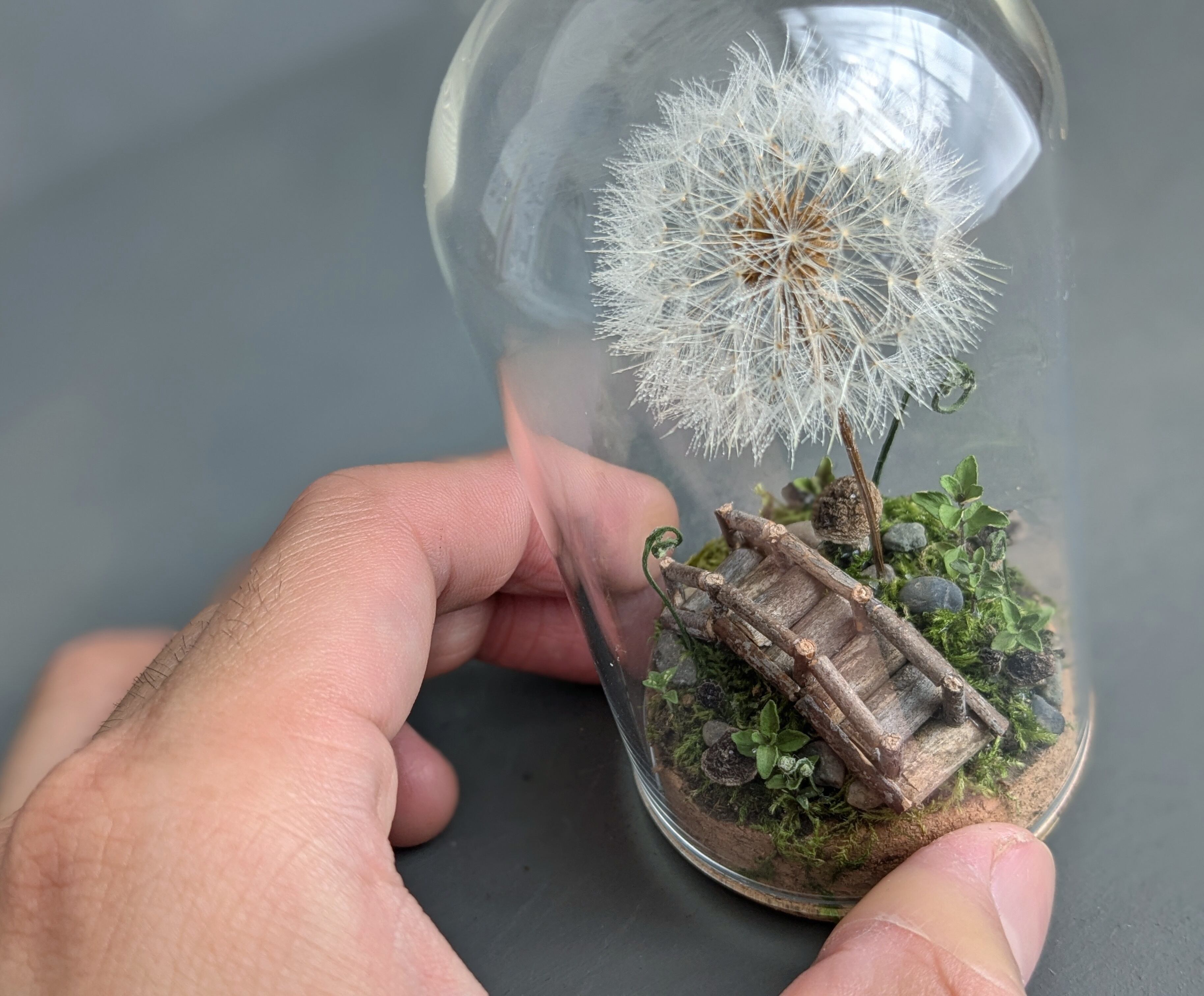 ガラスドームに入った綿毛のオブジェ。苔や葉など、全てドライにした植物等を使っています。小さな橋から見上げると、大きな木のような綿毛。