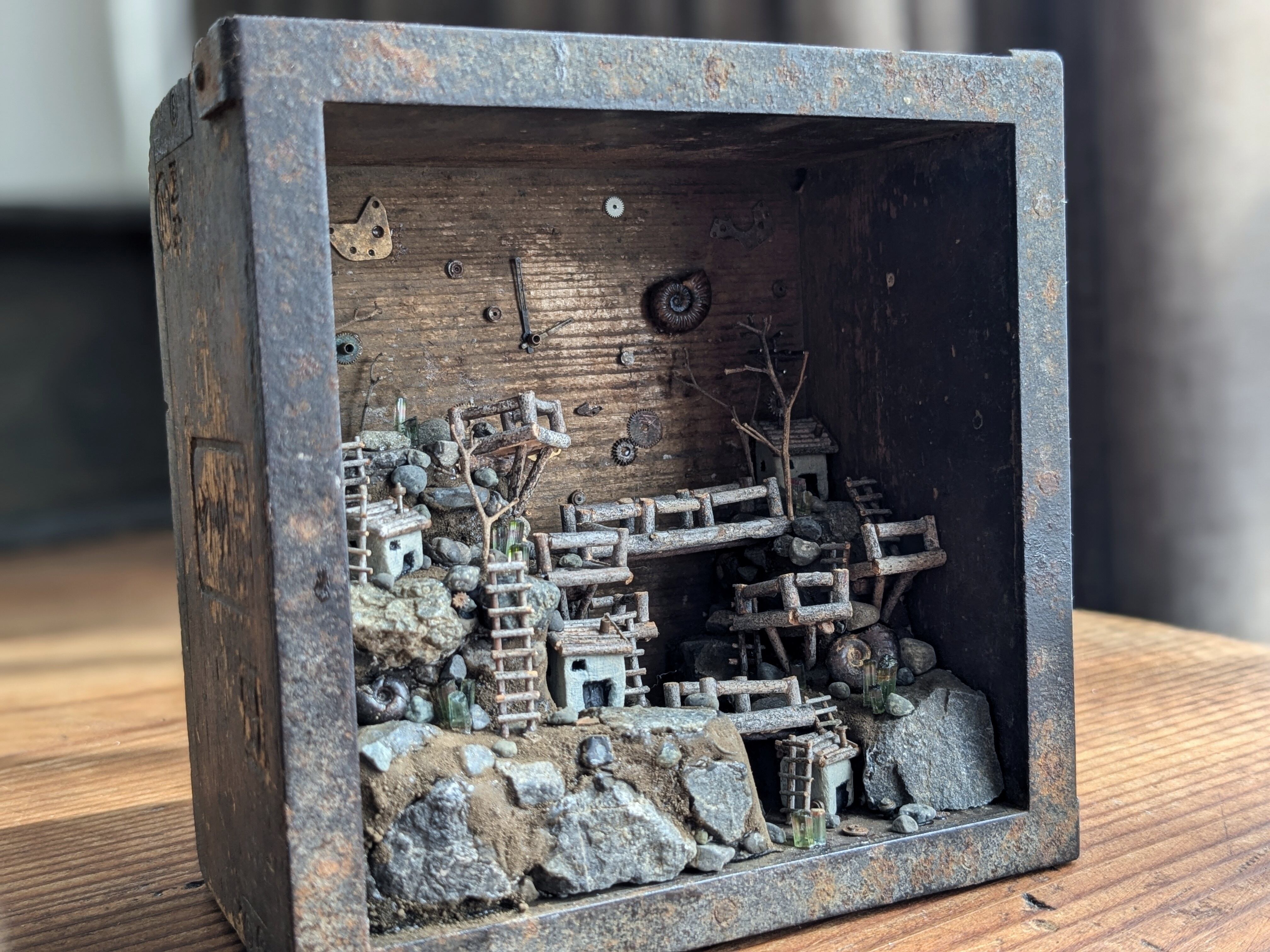 四角い升に入った街のオブジェ。石膏粘土や木の枝、時計の部品、アンモナイト、トルマリン原石等を使っています。