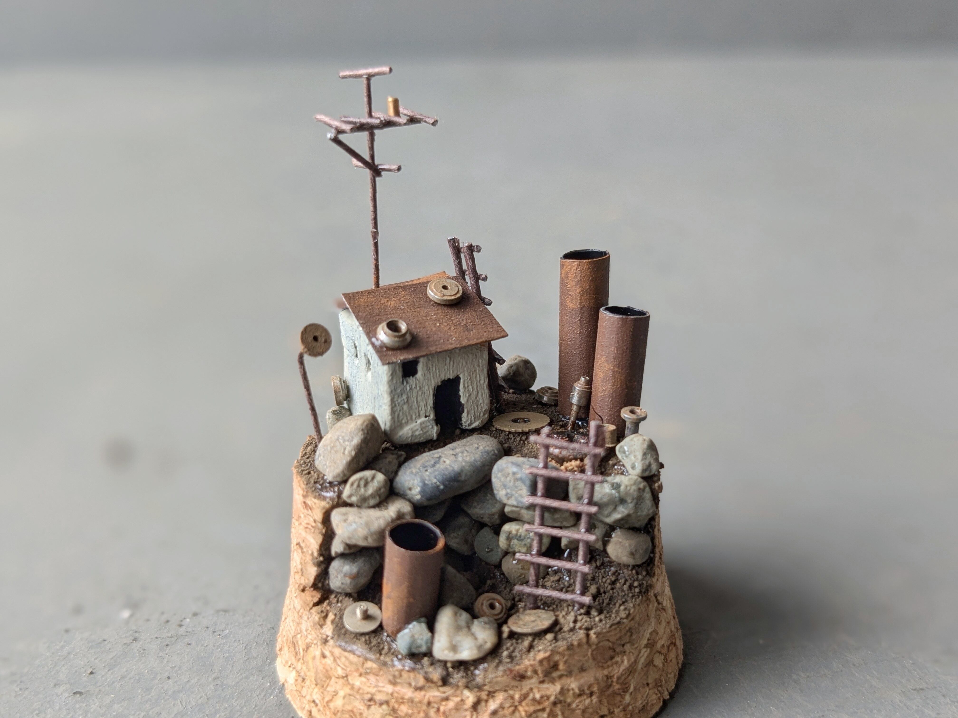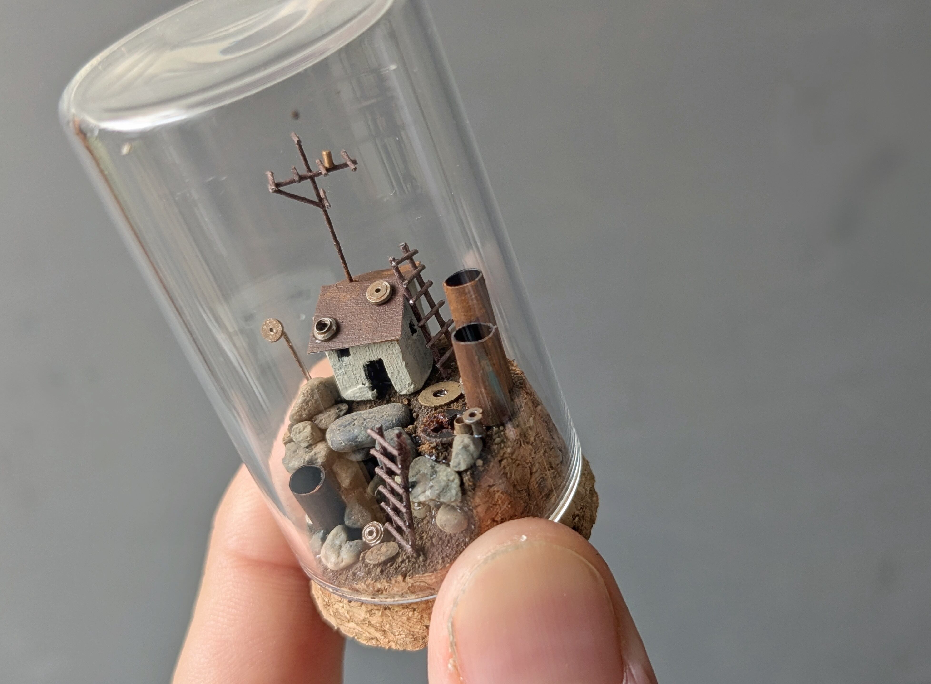 小瓶に入った錆びれた町の小さな家のオブジェです。