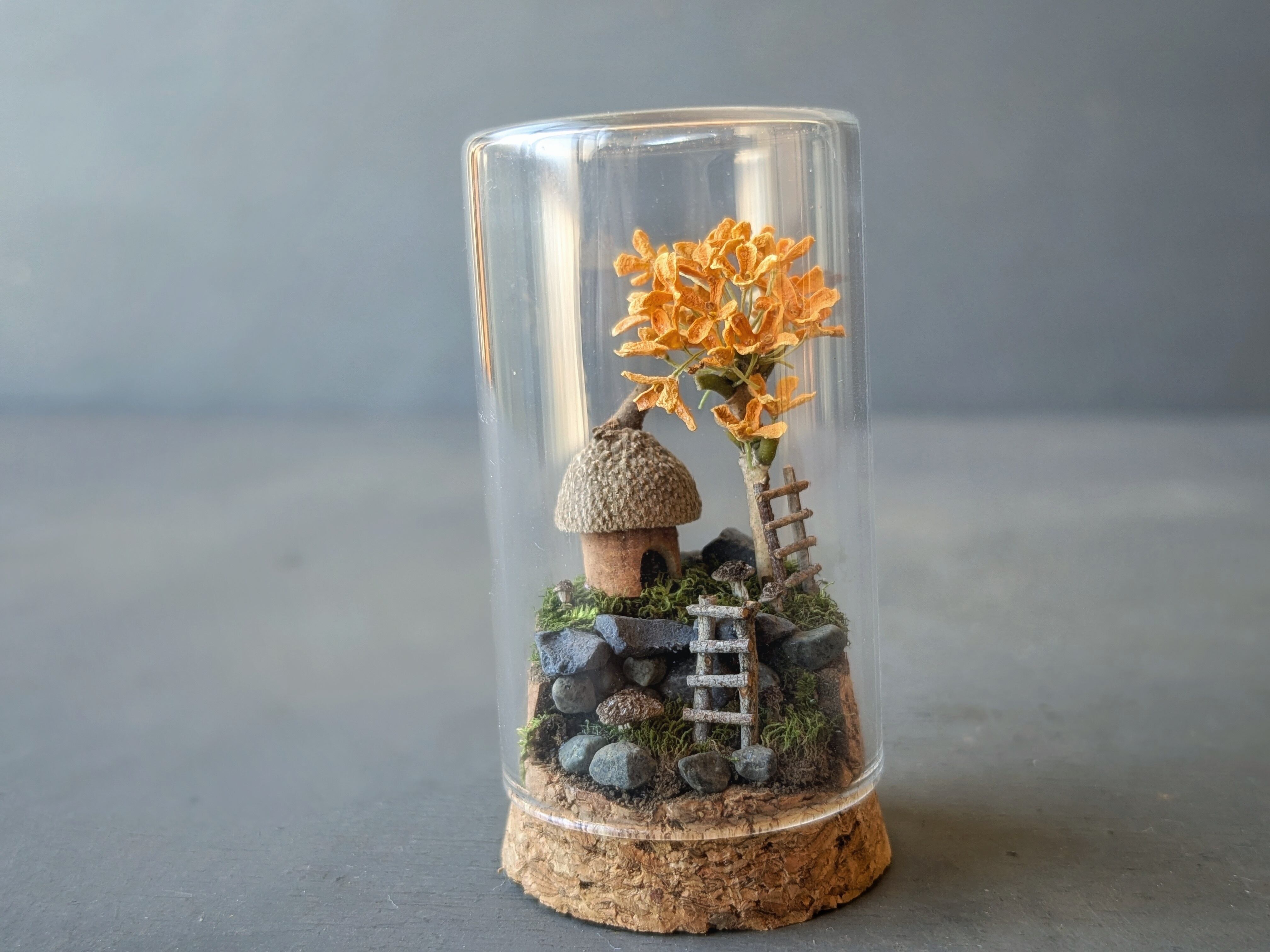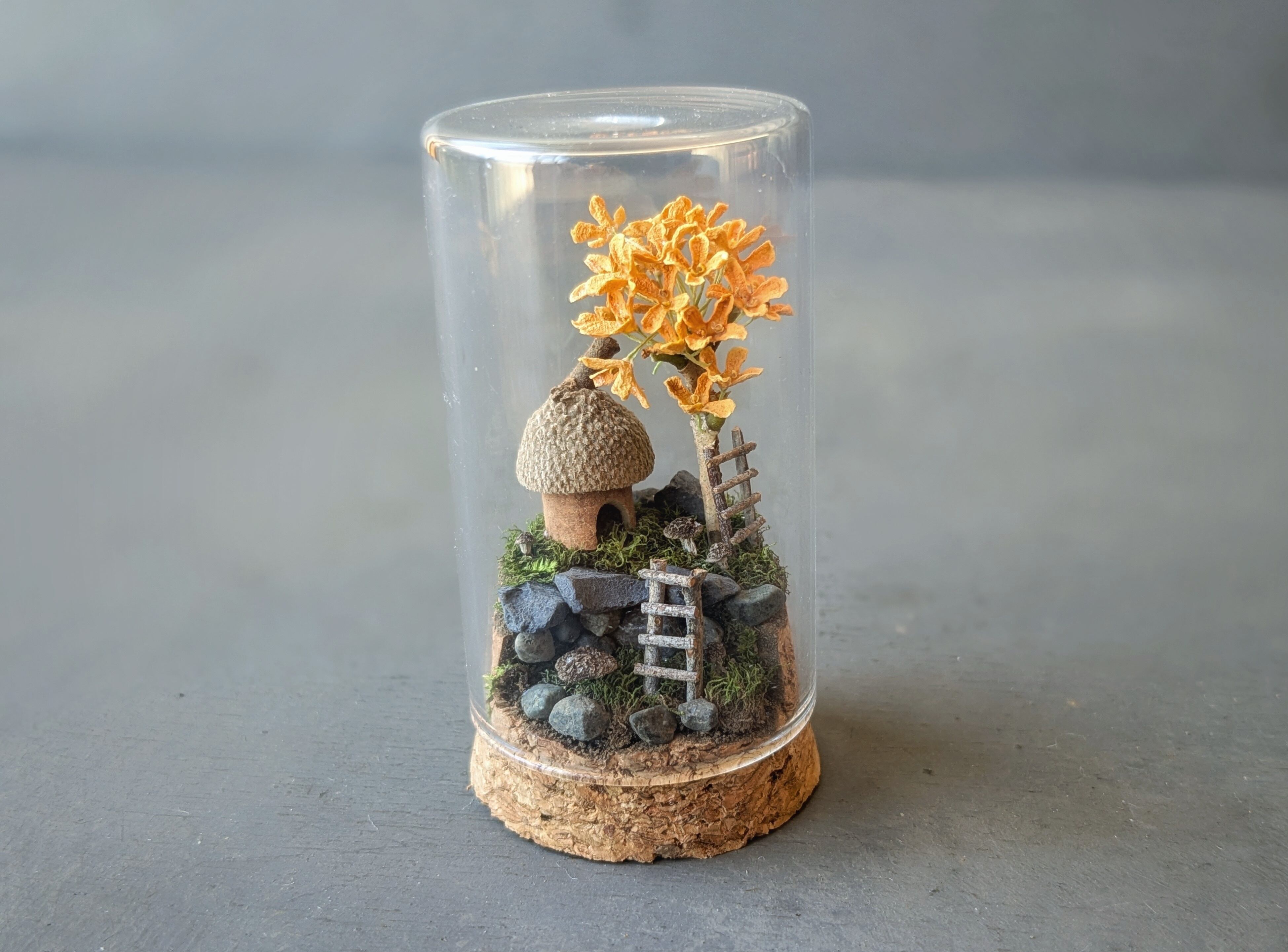 小瓶に入った、どんぐり帽子の家と金木犀のオブジェ。梯子を登って、金木犀を摘もう。