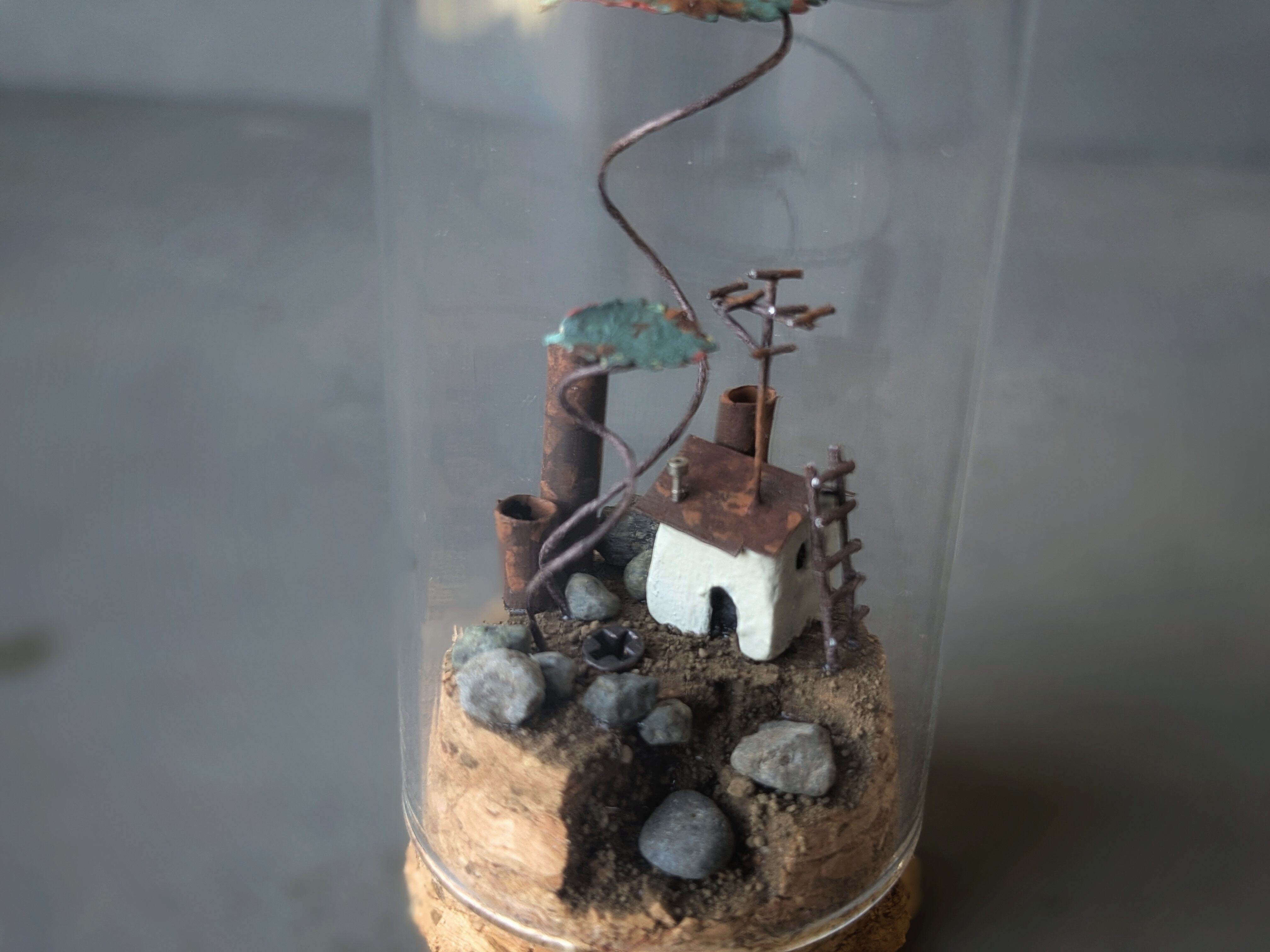 小瓶に入った、錆びれた町の小さな家のオブジェ。冷たい木枯らしが吹き、葉っぱがひらひら飛んでいます。