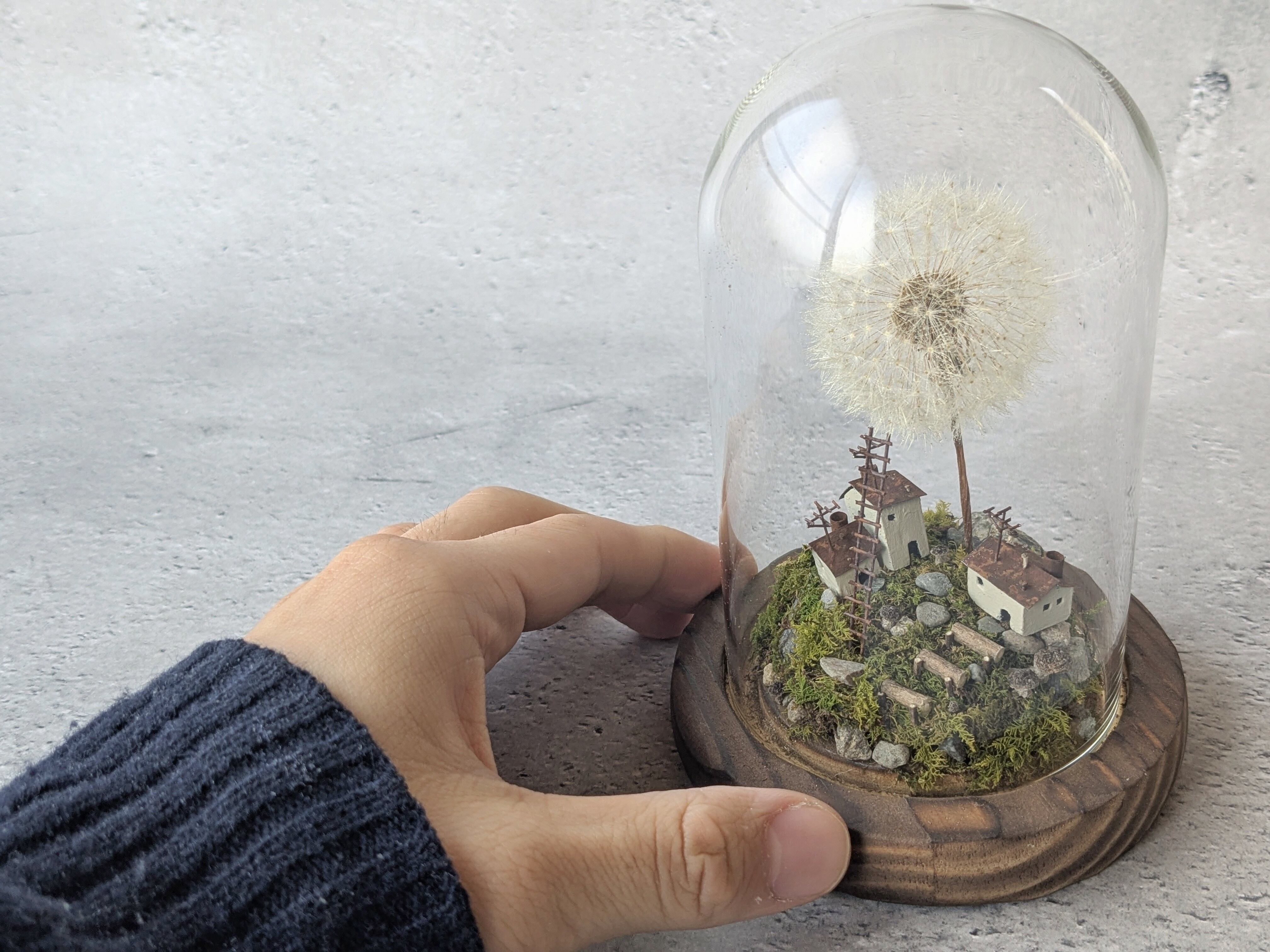 ガラスドームに入った綿毛と錆びた家のオブジェ。苔など、全てドライにして制作しています。